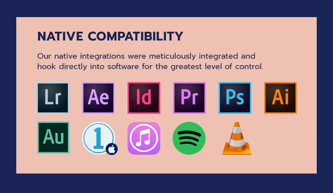 Hiện tại số lượng phần mềm tương thích tốt với Creative Console cũng khá ổn, từ các phần mềm chỉnh sửa ảnh như Lightroom, Capture One, Photoshop cho đến các phần mềm dựng phim và làm âm thanh như Premier, Audition .v.v.